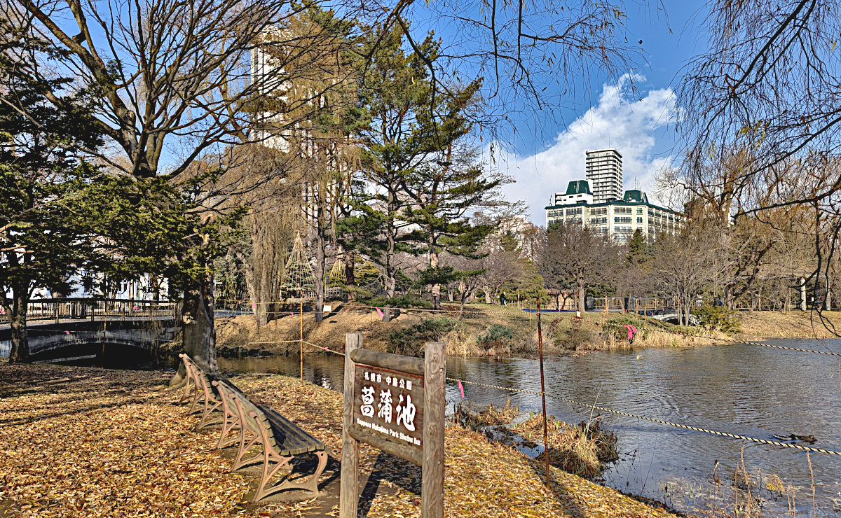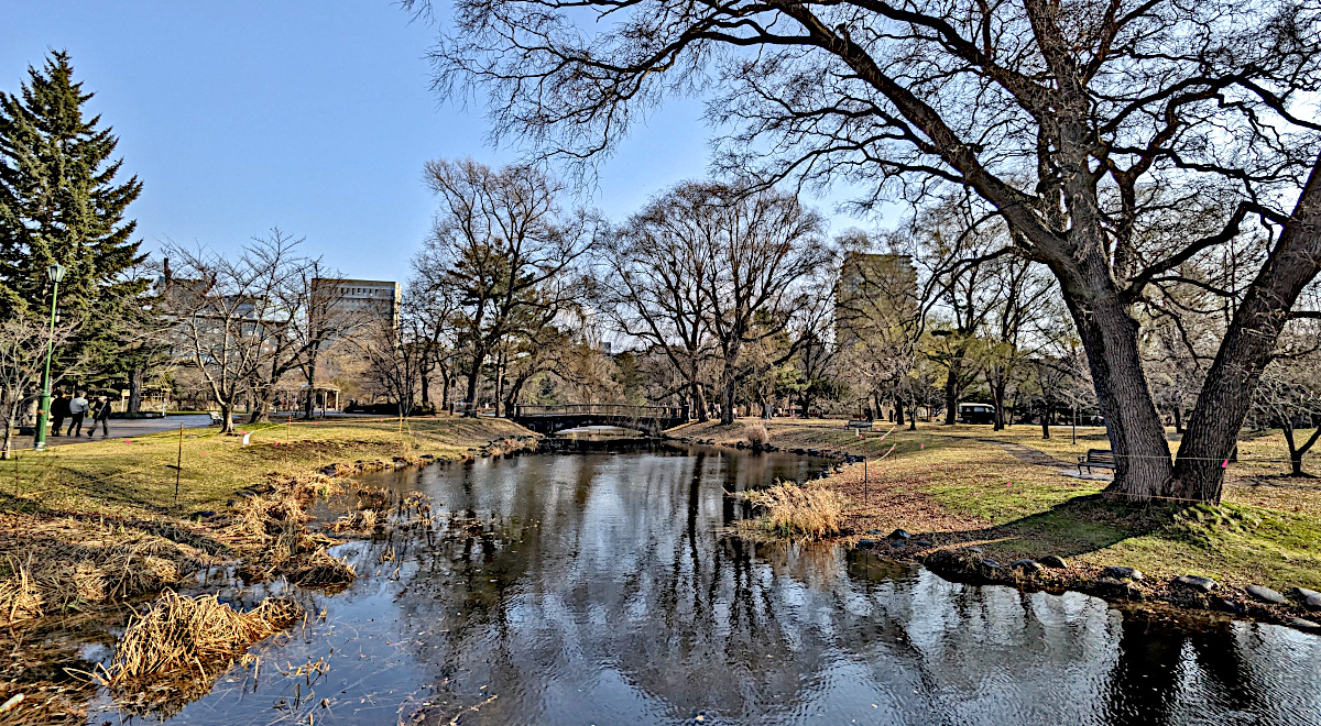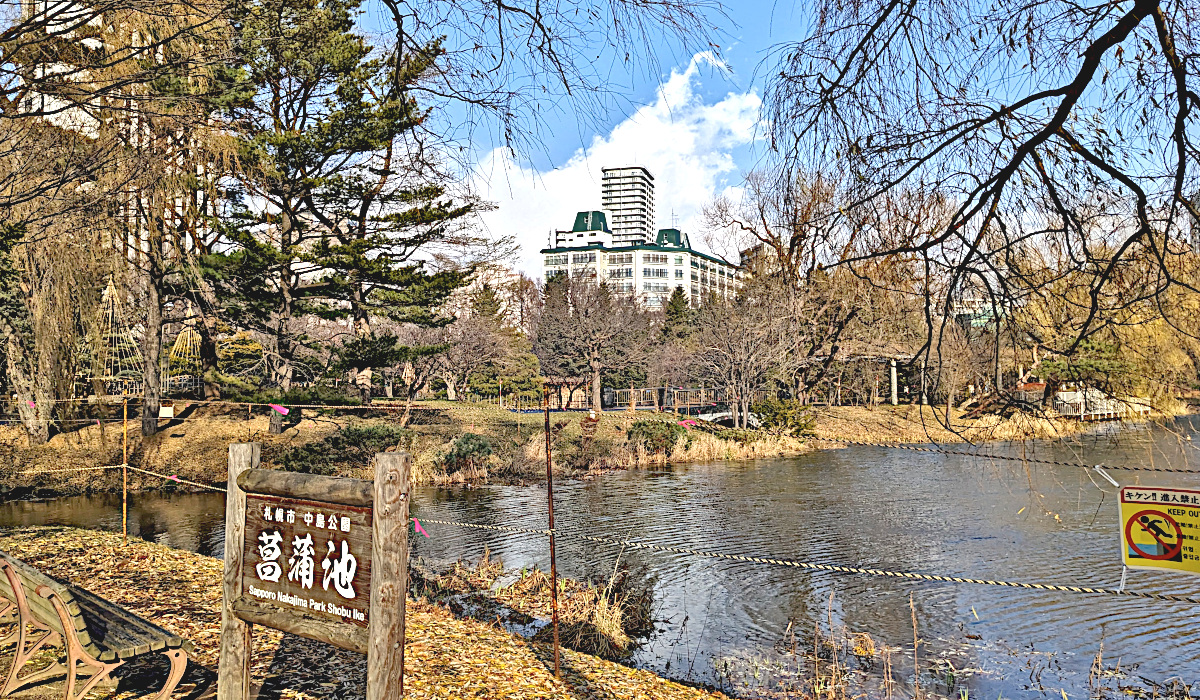 お気に入りの公園も春から晩秋まで、私達を楽しませてくれました。北海道も本州のように暑〜い夏になって、四季の判断が分かりづらくなっています。冬場の11月から春3月中旬ぐらいまでは、じっと雪が溶け始めるのを待つしかありません!今日の写真は、冬を迎える前のまだ雪のない一瞬の寒々とした中島公園の姿です。