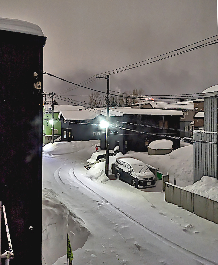 明日3日は「山の上病院」で朝9時40分受診です。今日のドカ雪の影響でまたまた交通麻痺状態なので、道路の除雪の状態が心配です。通常は20分~30分の距離ですが、1時間はかかりそうです。今日はまだ生活道路に除雪が入っていませんので、道路状況は酷い状態のままです。新川通が渋滞しているので、時々車が侵入して来ますが止めたほうが良いですよ。「スタック」しても助けられませんから、自己責任でお願いします。しかも道路がグチャグチャになって、周りの家々にも迷惑が掛かります。