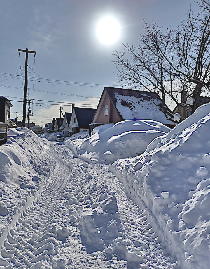 札幌市は今年の「パートナーシップ排雪制度」を取りやめて、交通量の多い生活道路を優先して、札幌市が全額負担して緊急除雪を行うそうです。交通量の多い生活道路の範囲ってどの辺をさすのでしょうか?昨夜入った除雪車の置いていった残骸を雪棚に載せてから、我が家の周りの町内をちょっと歩いて見ました。車が1台分しか通れない道幅になっていて、道路も曲がりくねり積み上げられた雪山で、小さな交差点では左右の見通しが効かなくなっています。急な飛び出しも冬場だけではありませんが、特に冬場は視界が効かないのでいつも危険が一杯!