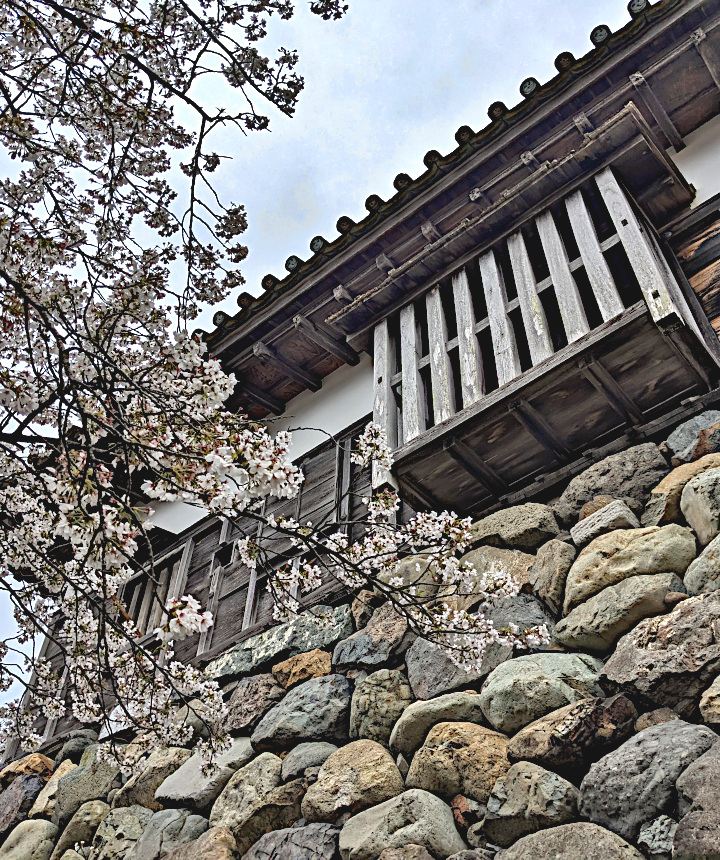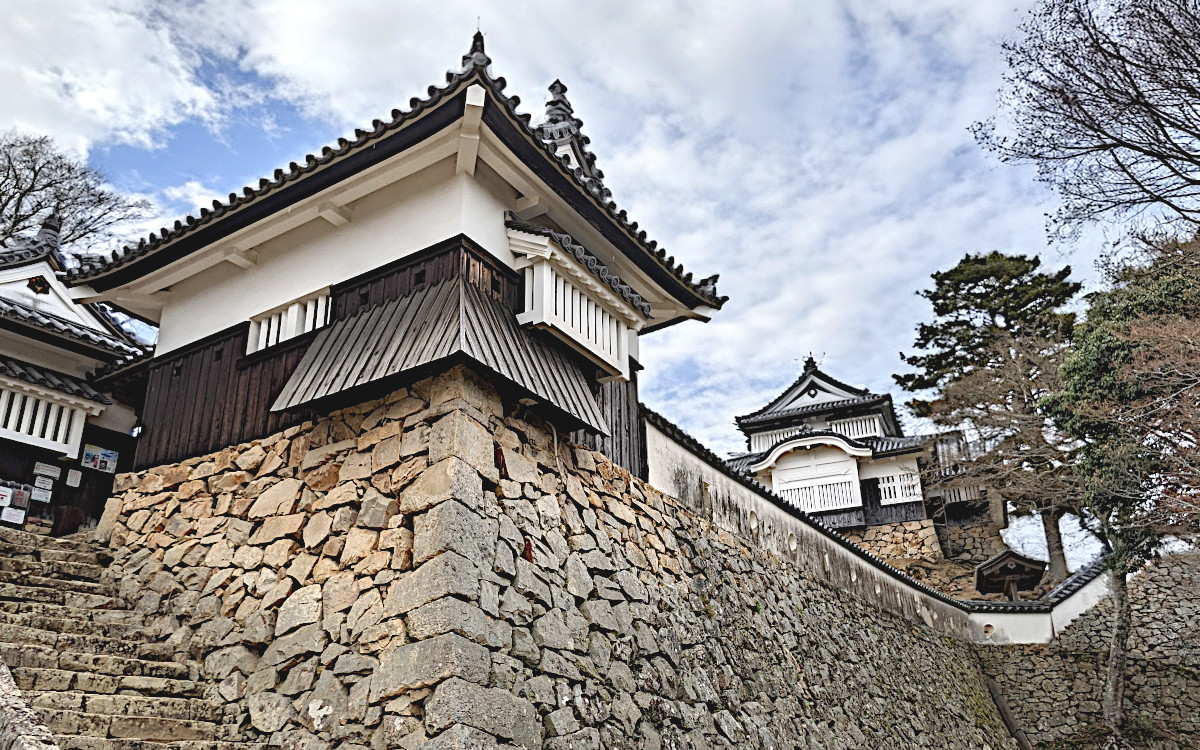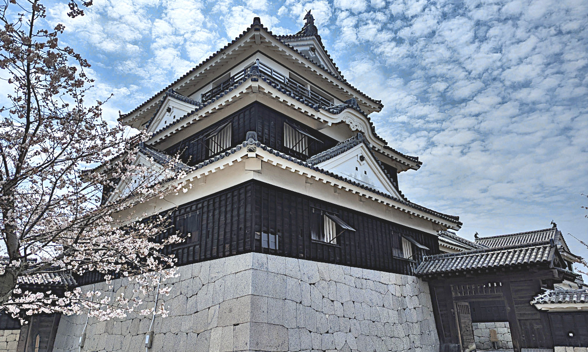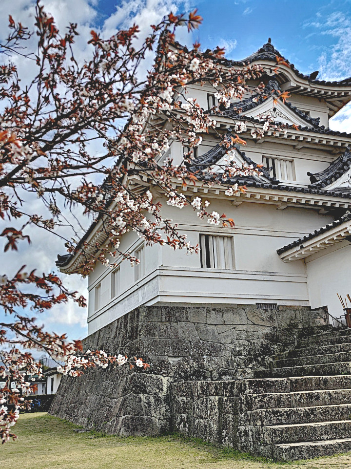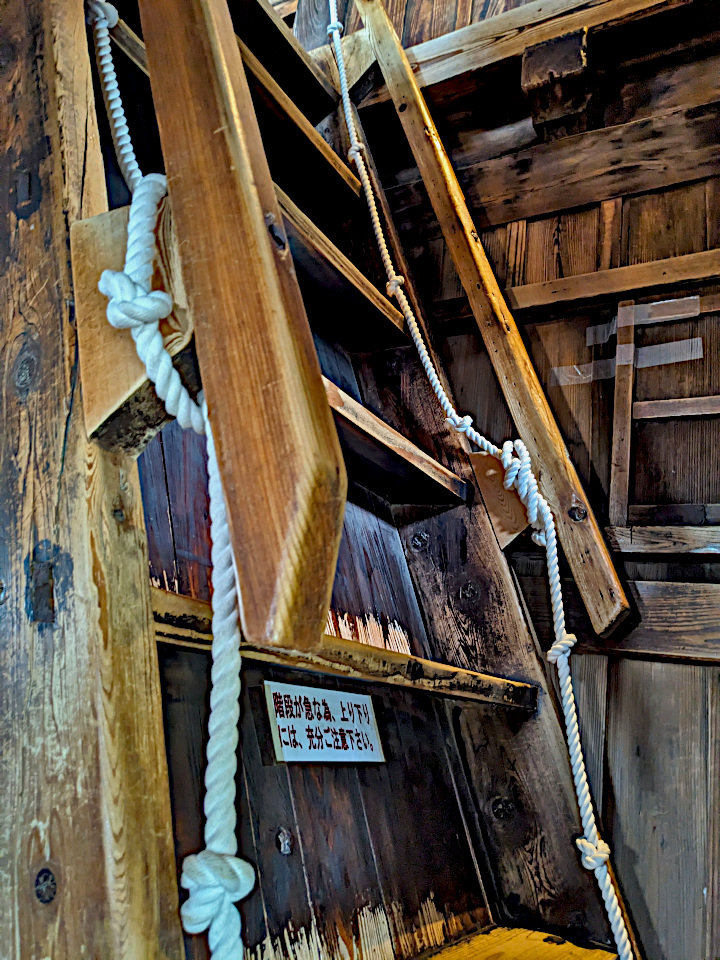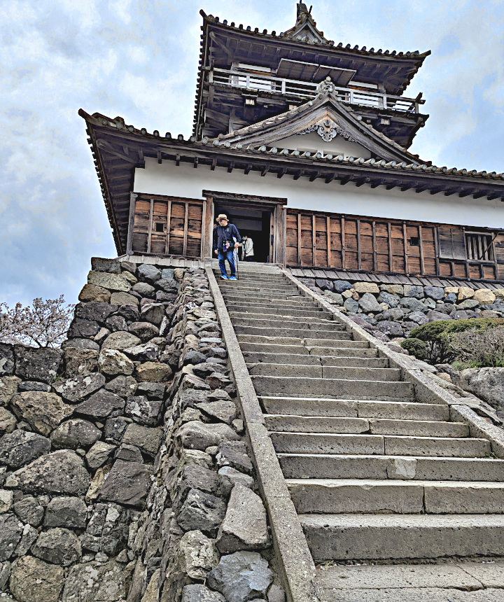 4泊した「HOTEL AZ 三重名張店」から、「福井丸岡城」へ向けて朝8時半に出発。名張市からからは伊賀市や甲賀市を抜けて一般道グリーンロードを彦根まで行き一休み。国道8号線を長浜市まで走り、長浜ICから北陸自動車道に入り丸岡ICで降りて「丸岡城」へ、午後1時半に無事に到着。勿論桜も満開で丁度「丸岡城さくら祭り」も開催中だったので盛況でした。何と言っても天守の階段が特に急で、観光用に補助縄が取り付けられているくらいです。それでも登るのも下るのもに一苦労です。現存天守の中でも急階段で有名な「犬山城」より凄い階段です。