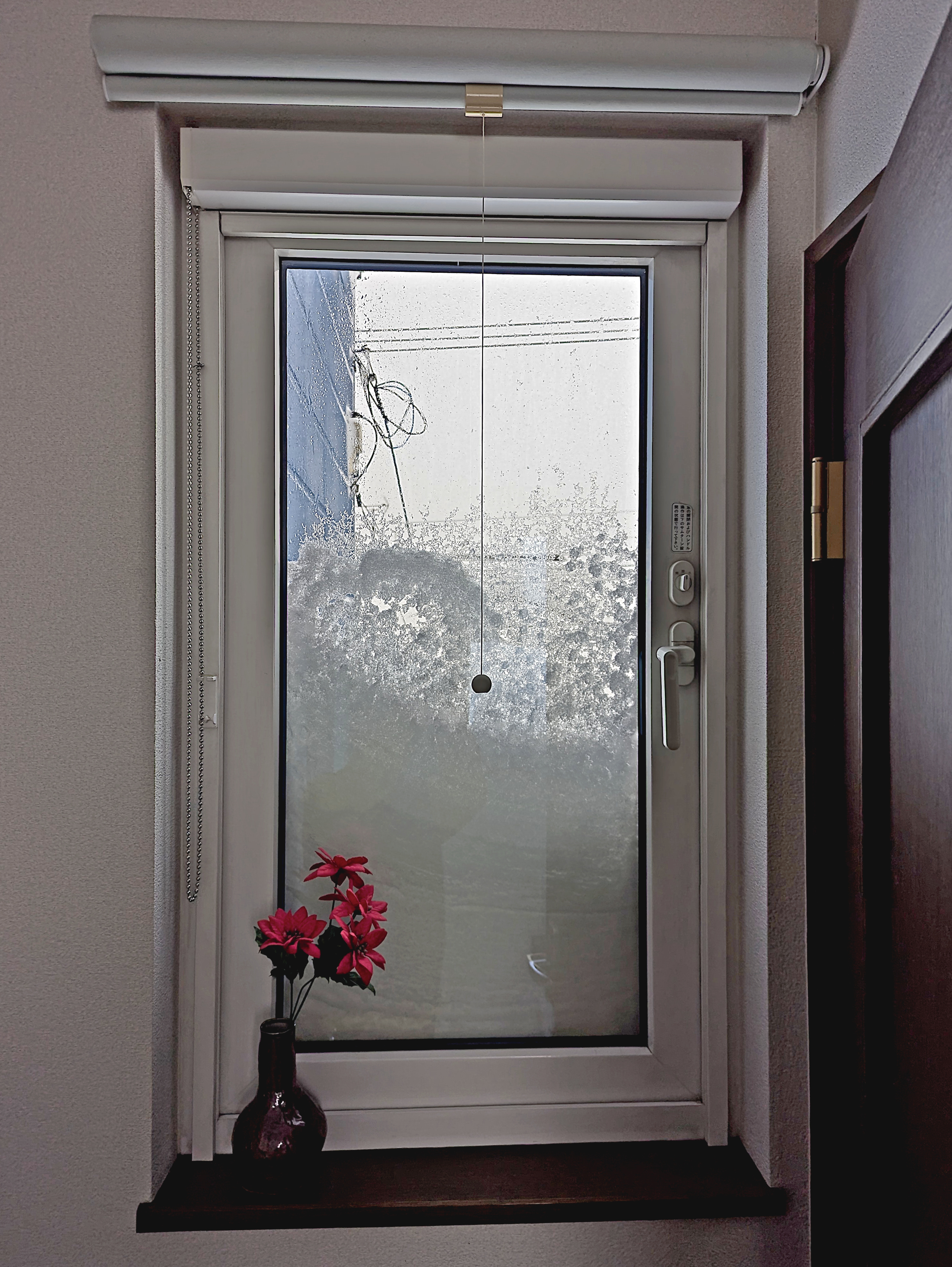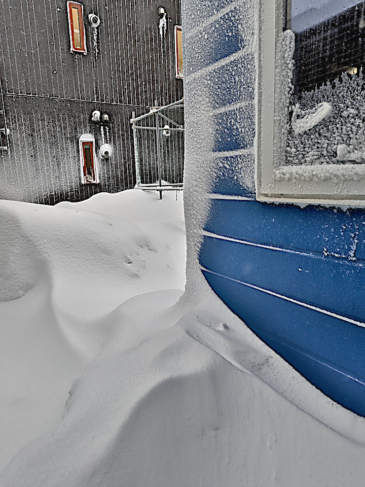 深夜から台風のような強風だった見みたいですが、私は全く知らずに爆睡中でした。今始まった事ではありませんが、雷が鳴ろうと強風が吹こうとめざめず、さすがに地震だけには敏感のようです。今日は朝から「雪かき」は覚悟していましたが、気温が高めなので家の窓や壁には、雪がアメーバのような模様になっていました。気温が低ければ、神秘的な雪の結晶なのでしょうが。雪の降り方が弱くなった所で1回目の「雪かき」スタート。