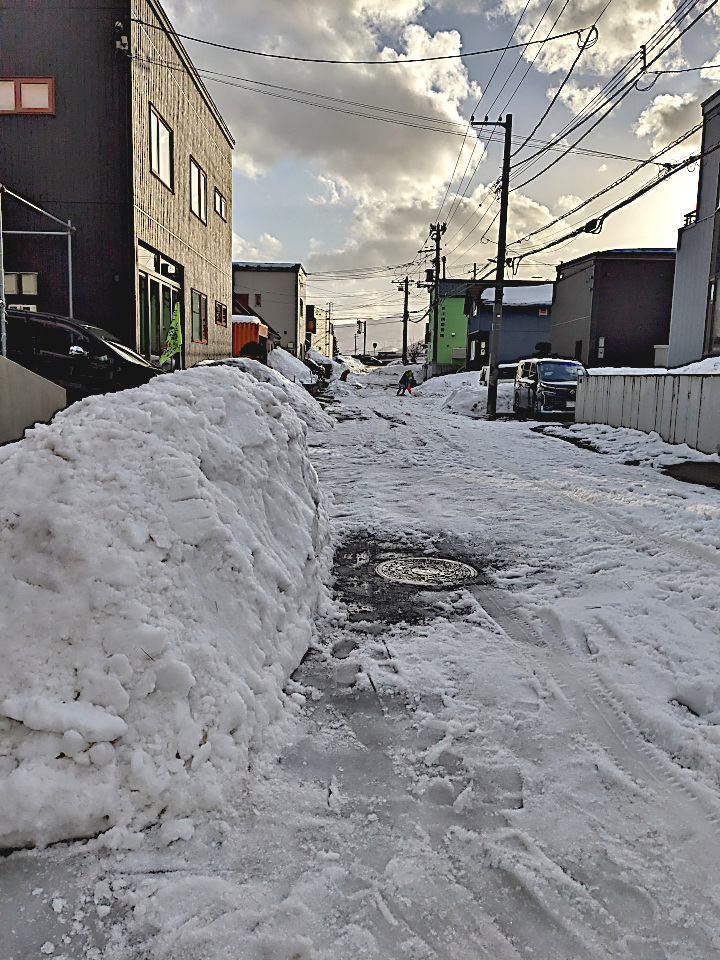 札幌市は今年の「パートナーシップ排雪制度」を取りやめて、交通量の多い生活道路を優先して、札幌市が全額負担して緊急除雪を行うそうです。交通量の多い生活道路の範囲ってどの辺をさすのでしょうか?昨夜入った除雪車の置いていった残骸を雪棚に載せてから、我が家の周りの町内をちょっと歩いて見ました。車が1台分しか通れない道幅になっていて、道路も曲がりくねり積み上げられた雪山で、小さな交差点では左右の見通しが効かなくなっています。急な飛び出しも冬場だけではありませんが、特に冬場は視界が効かないのでいつも危険が一杯!