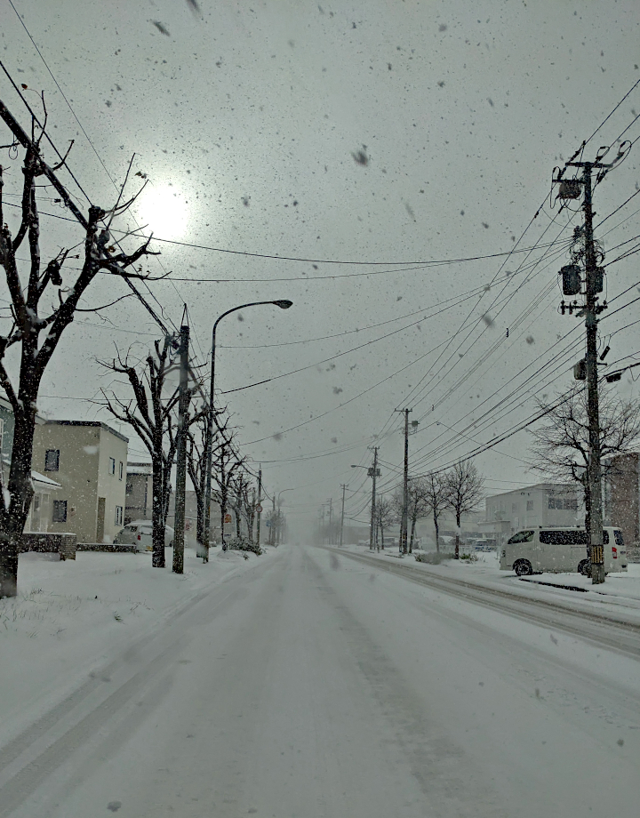 買い物も終わってお店を出た頃には、すでに10cm以上の積雪で外は白銀の世界に変貌していて、しかも真冬並みの猛吹雪模様です。いきなり真冬の嵐でちょっと吃驚!この時季で吹雪とはさすがに驚かされました。同じ北区内でも、屯田から新琴似そして新川と雪の降り方も全然違って、新川の我が家に近づくと雪もそんなに積もっていなくて、高々4km程の距離なのにこれほど積雪量や降雪状況が違うとは!午後からは新川でも積雪量が多くなって来ていますが、夜半前には雪も止む予報です。