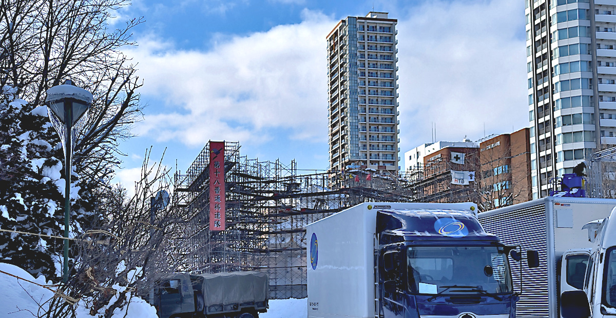 今週25日から災害級の「ドカ雪」で、交通網が止まってしまい、除雪作業が回らなくなっています。二車線の道路でも、バスが交差出来ないほど道幅が狭くなっています。路面脇の大盛りの雪の残骸を見ても、今回のドカ雪が凄かった事がわかります。午後からの用事の前に、2月4日から開催の「さっぽろ雪まつり」の写真を撮って来ました。まだ準備途中なので、どんな雪像なのかサッパリ分かりませんでした。いつの頃からなのでしょうか、雪像制作中は立入禁止のロープや塀で囲まれていました。