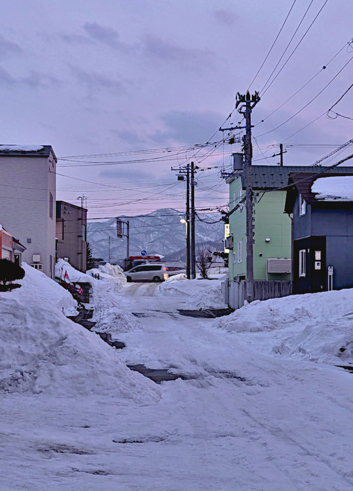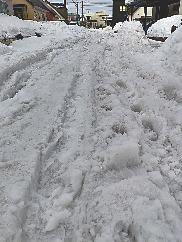 札幌市は今年の「パートナーシップ排雪制度」を取りやめて、交通量の多い生活道路を優先して、札幌市が全額負担して緊急除雪を行うそうです。交通量の多い生活道路の範囲ってどの辺をさすのでしょうか?昨夜入った除雪車の置いていった残骸を雪棚に載せてから、我が家の周りの町内をちょっと歩いて見ました。車が1台分しか通れない道幅になっていて、道路も曲がりくねり積み上げられた雪山で、小さな交差点では左右の見通しが効かなくなっています。急な飛び出しも冬場だけではありませんが、特に冬場は視界が効かないのでいつも危険が一杯!