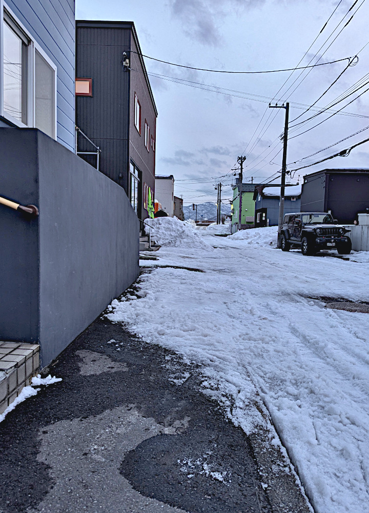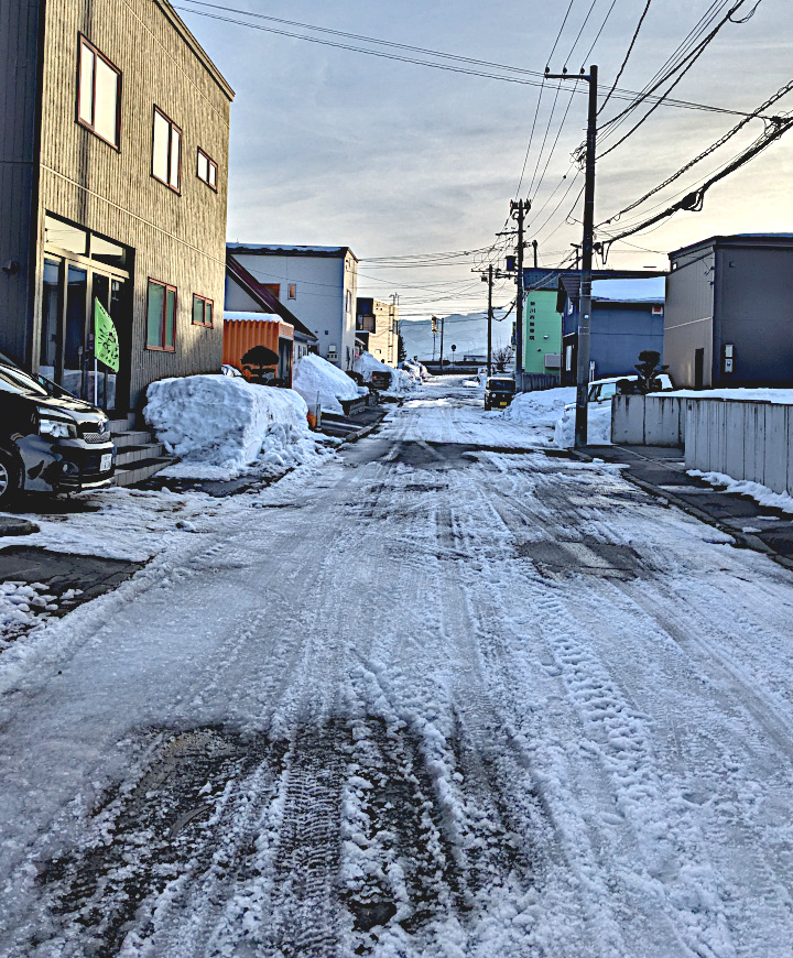 今日も朝から、混雑する新川通りから近道をしようと、車が我が家の前の生活道路に入り込んで来ます。道路状態を確認していないようで、午前中に4台がスタック、14時時点でさらに1台スタックしました。それも同じ場所で3台もなのですから。親切なご近所さんに助けられて無事、来た道を戻って行きました。スタックした車の置き土産のように、道路はさらにグシャグシャになったので、除雪機を持っているご近所さんが、デコボコ路面を削り取ってくれています。ありがたいですね!